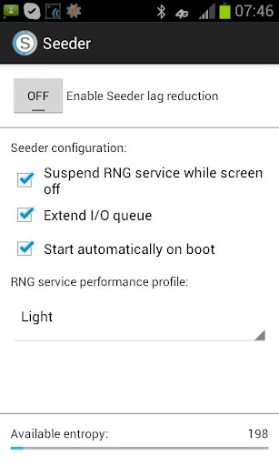 Seeder is a service for root users. It assists the kernel in “topping off” the entropy pool by re-seeding it with data from the non-blocking (high performance) random device. Optionally, it can also help alleviate MMC I/O contention by extending the I/O queue, allowing the I/O scheduler to make better decisions, and combine more writes.